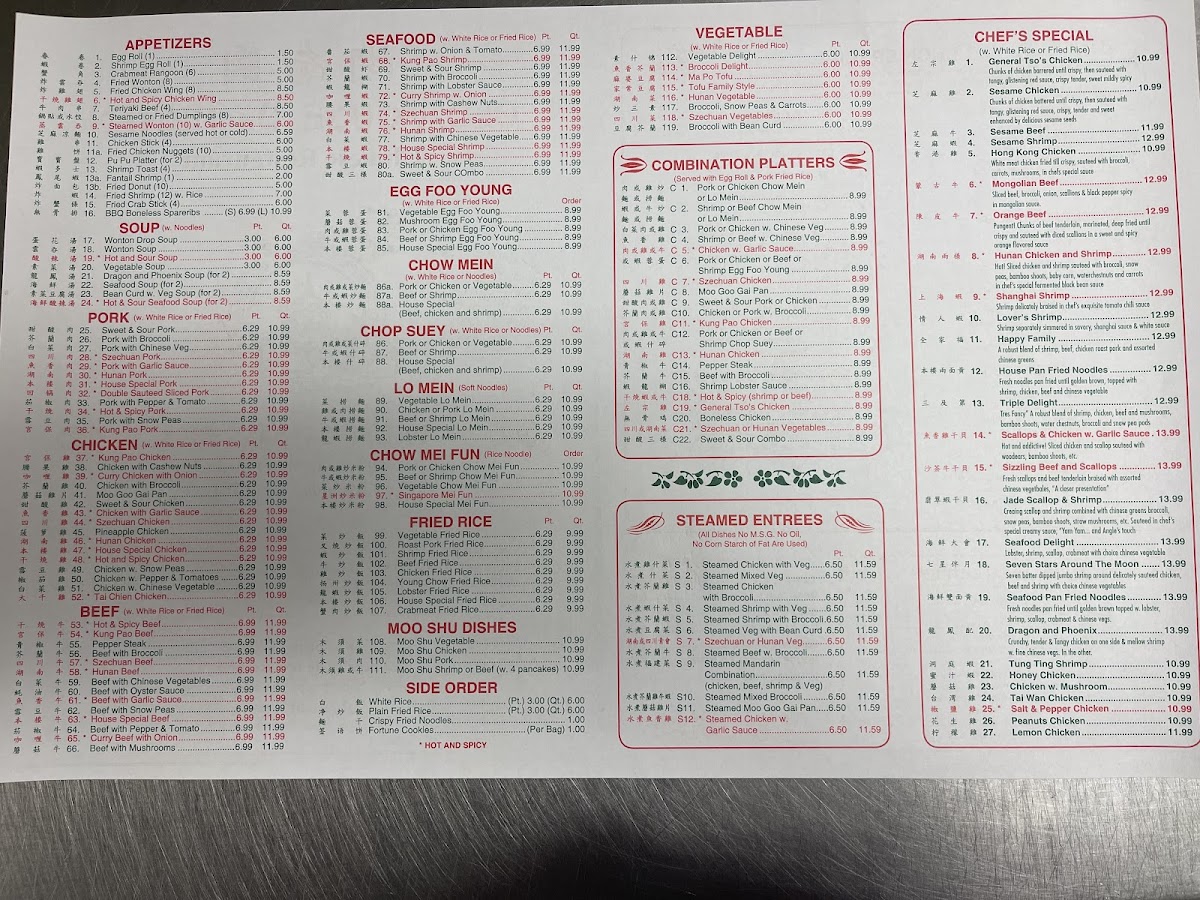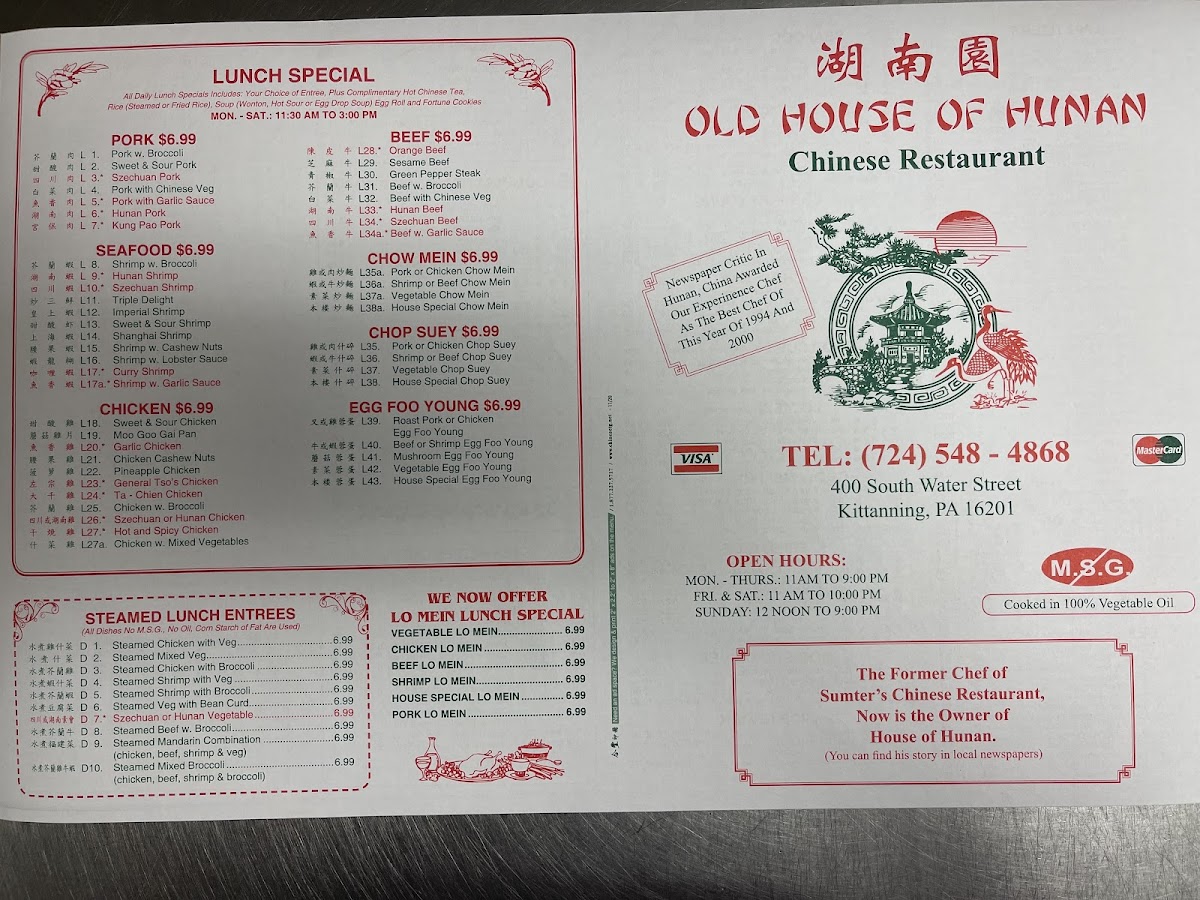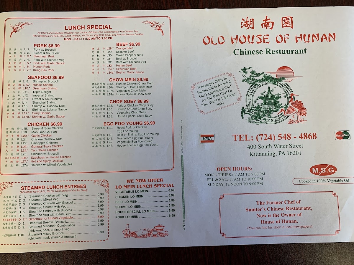 Old House Of Hunan offers a vibrant menu deeply rooted in authentic Chinese cuisine, nestled in the heart of Kittanning, PA. This charming restaurant shines with its diverse selection of steamed lunch entrees, such as Steamed Chicken with Broccoli and Steamed Shrimp with Vegetables, delivering light yet flavorful options. For lovers of bold tastes, their beef dishes, including Orange Beef and Green Pepper Steak, burst with rich, savory flavors that showcase traditional Hunan and Szechuan influences.